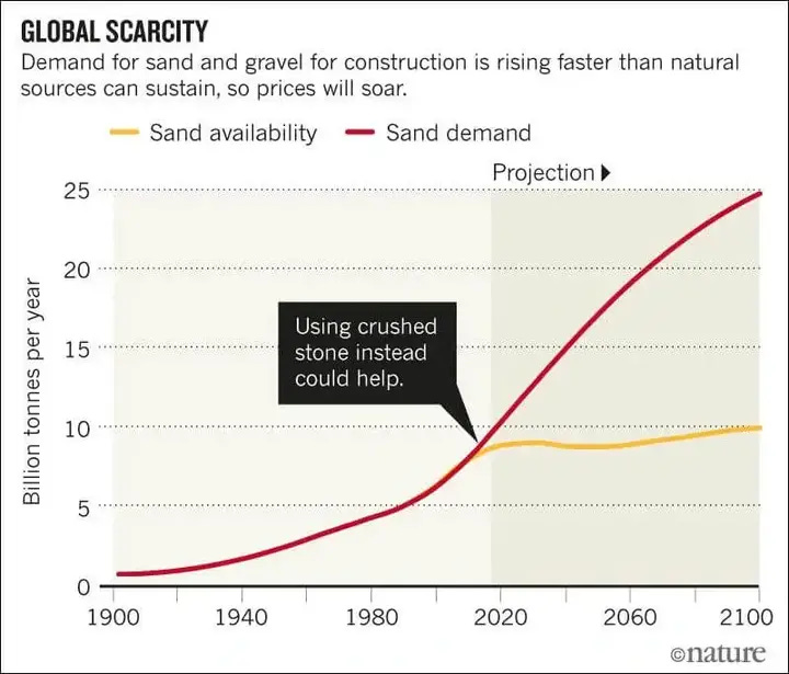 Sure, we can take sand from the beaches and riverbeds (both of which are terrible for the environment), but since it’s so heavy, it’s expensive to transport. And as we use up all the most convenient sources of sand, we’re having to ship it farther and farther. We could also crush rocks to create our own sand, but that is very energy intensive. And thus, very expensive.