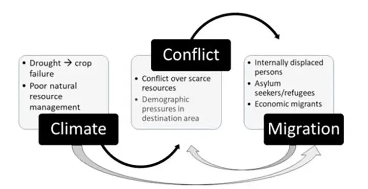 Again, this is just a fact of human nature. A peer-reviewed study called “Climate, conflict and forced migration” confirms that climate change will lead to more wars and more refugees. The graphic below explains how.