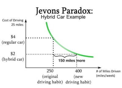 What’s the Jevons Paradox? Basically, when new technologies or government policy increase the efficiency with which a resource (such as fossil fuels) is used, the price drops. However, the lower price causes people to consume more, thus raising the price again and negating any efficiency gains.