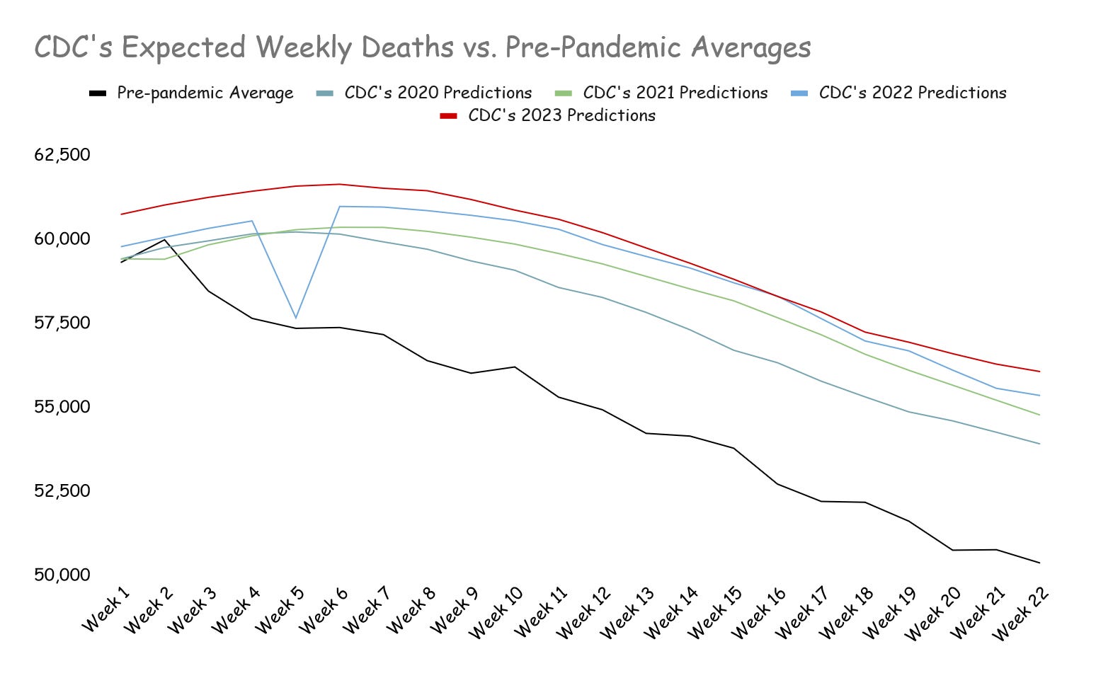 The CDC is predicting that roughly 4,000 extra people will die every week now than back in 2019. That explains why their excess mortality numbers look better than they did last year. You can even see a mistake in the 2022 predictions, where they seem to have forgotten to update it.