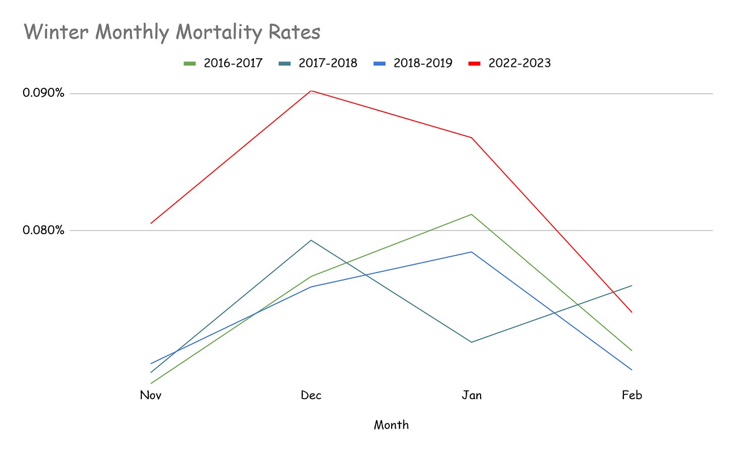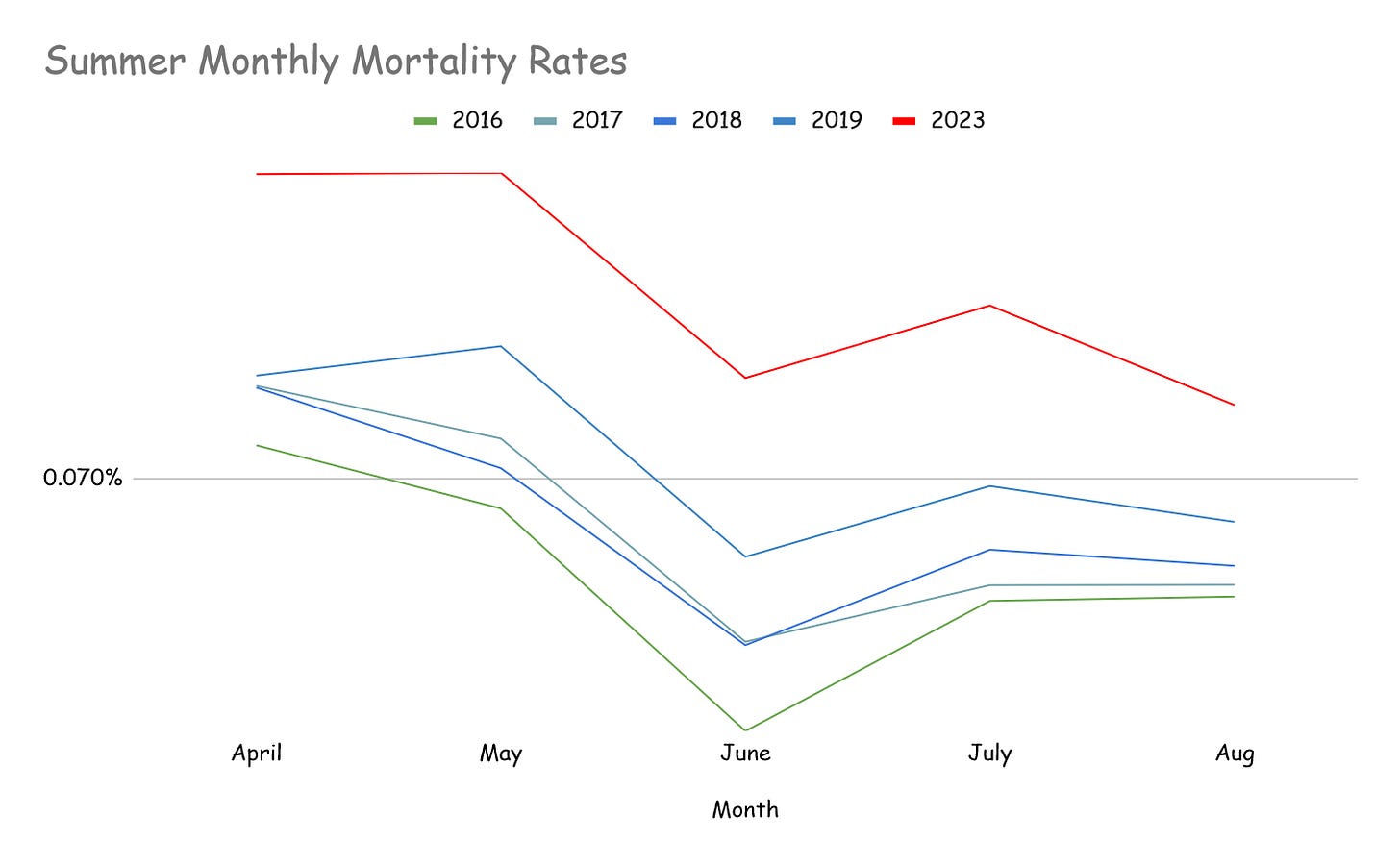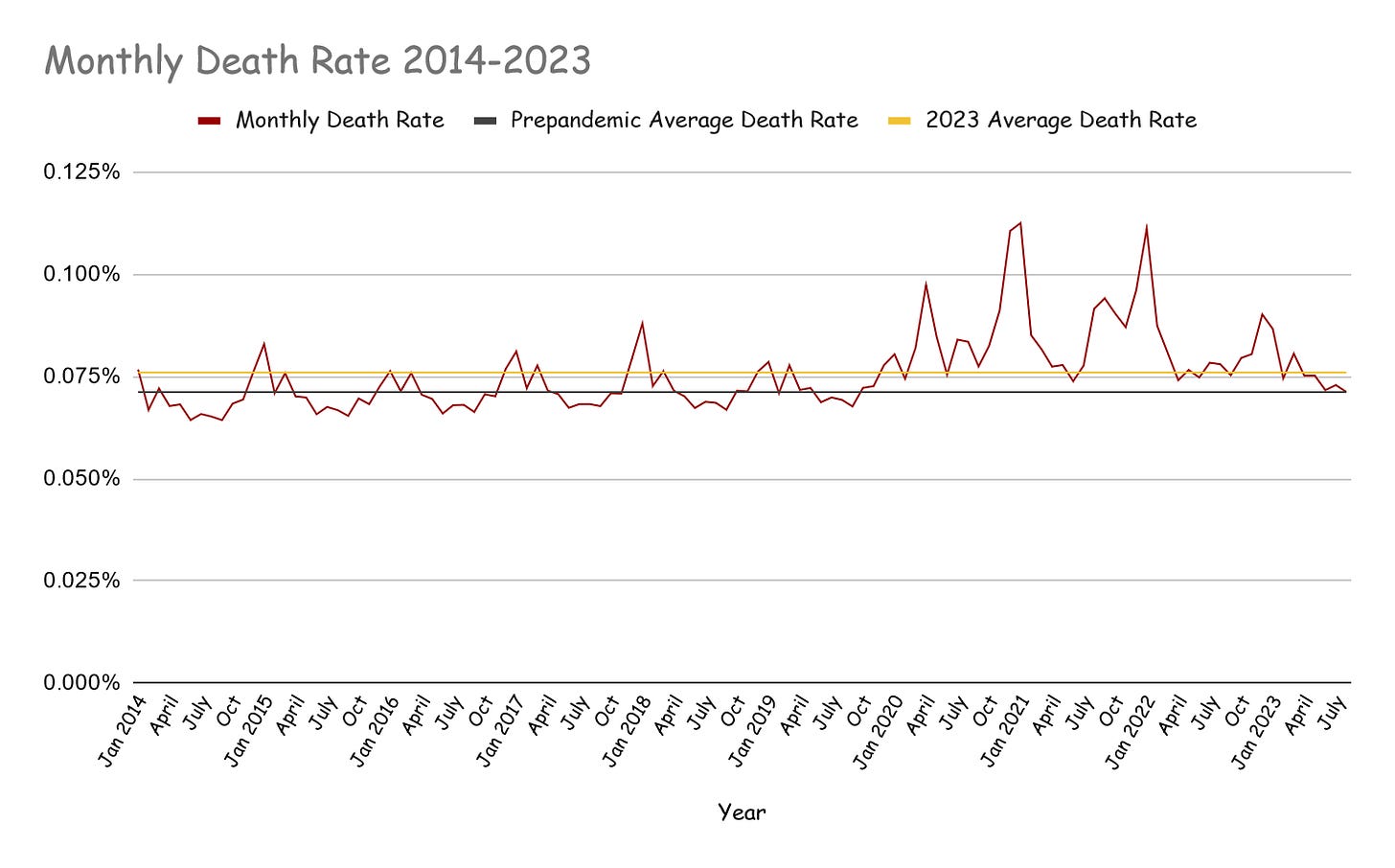 Even when you account for population growth, our death rate for 2023 remains well above the pre-pandemic death rate represented by the black line. You can see the average death rate for 2023 alone, represented by the yellowish orange line. It's well above the 2019 baseline. If you pay attention, you can also see that the monthly death rates during the summer now hover near the previous winter peaks. In other words, more people are dying during the summer now than they were dying during the winter, our worst months.