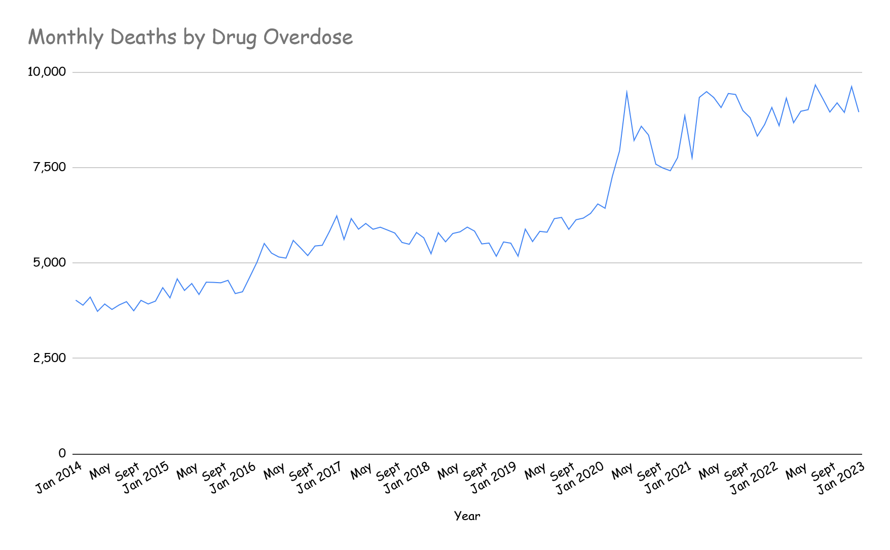 Fatal drug overdoses started going up during the late fall of 2019. They started hitting records in December and January of 2020. They exploded in March 2020 during lockdowns, and now they remain as high as ever. They account for some of the higher mortality rate, but not all of it.