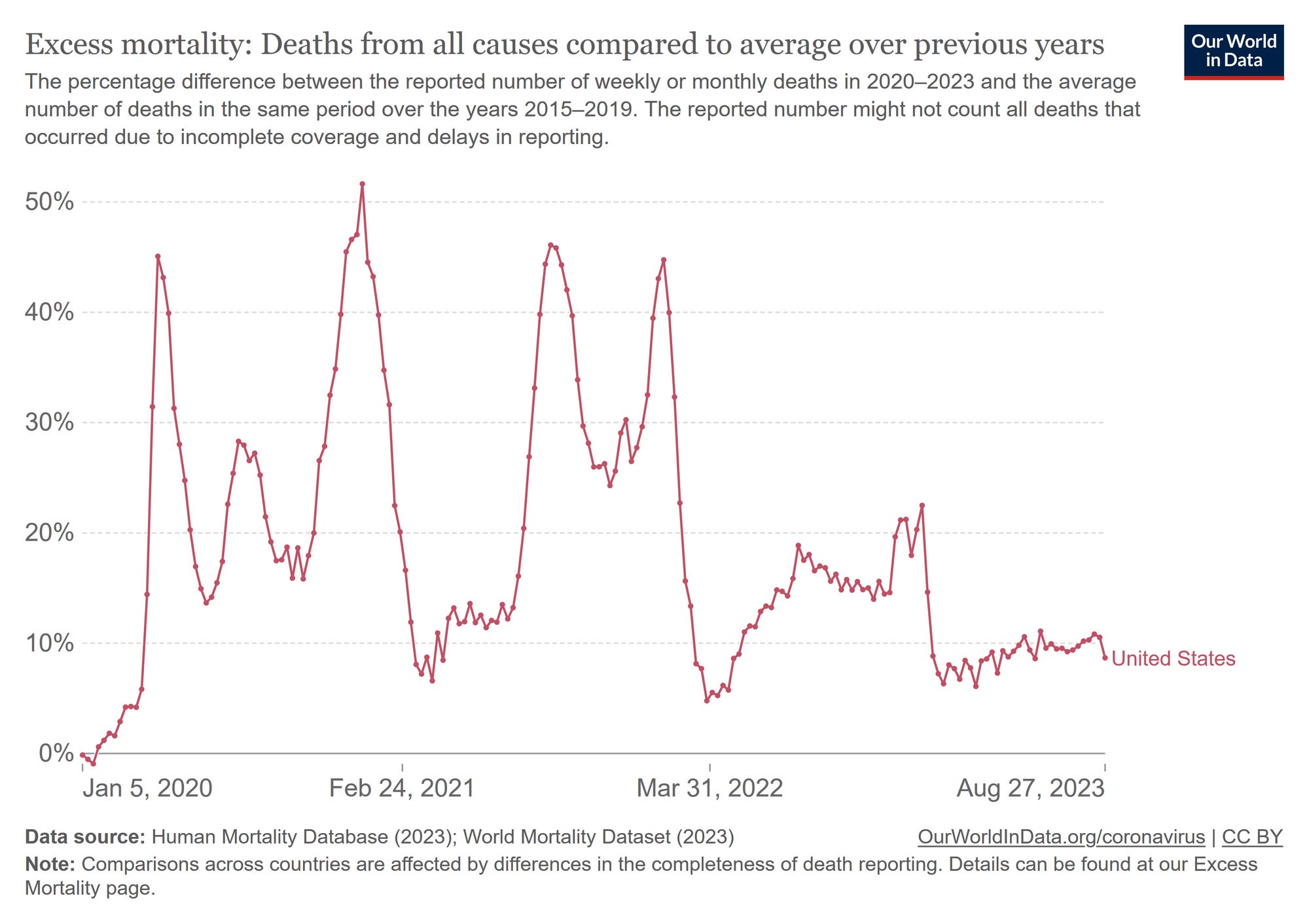 According to Our World in Data, excess mortality remained between 9 and 11 percent all summer long. They're not trying to cook their books like the CDC. They use the original mortality estimates. The surges might look less frightening, but 10 percent more people are dying all the time now.