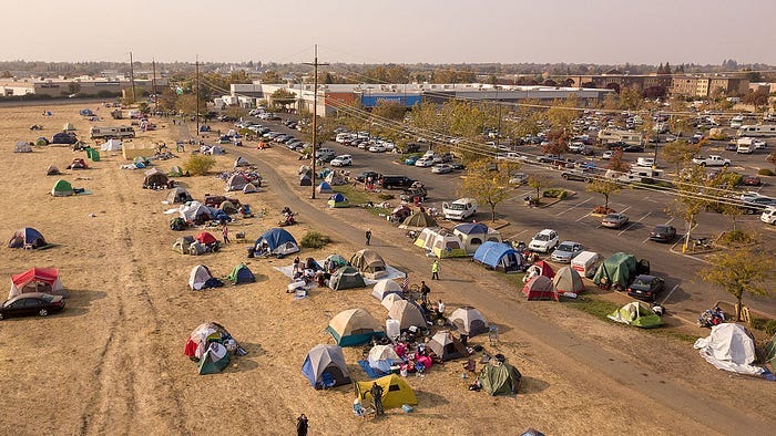 Without insurance, you’ll never even have a chance to recover. Nobody really does a good job of tracking what happens to climate victims, but homelessness in Chico (the nearest city) more than doubled after the Camp Fire. I guarantee that the vast majority of those people had no insurance or too little insurance.