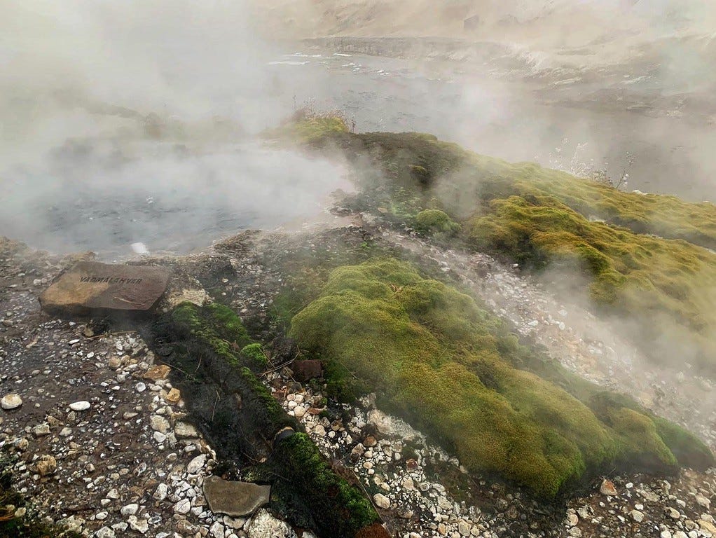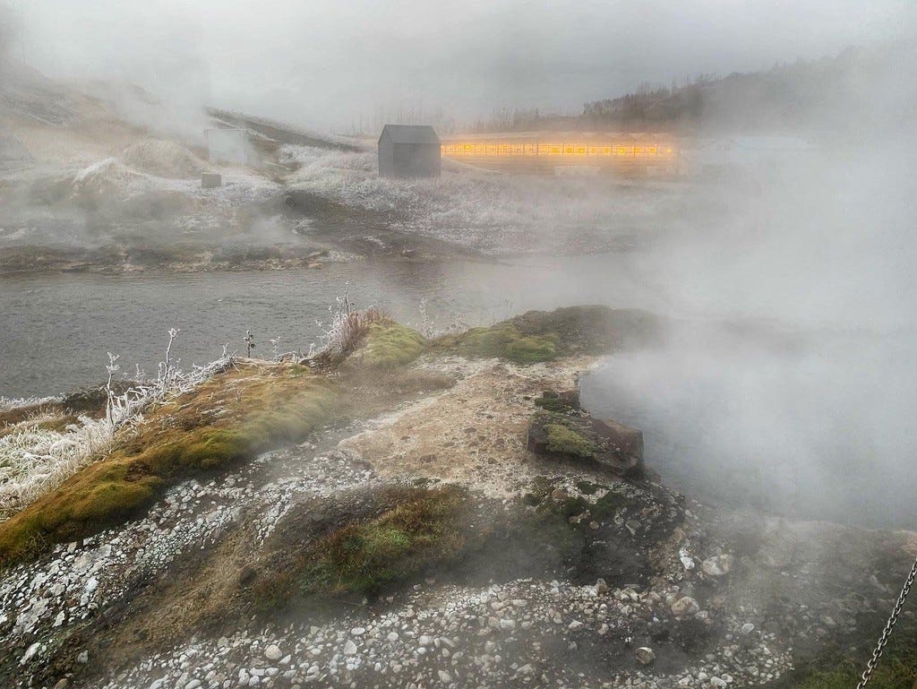 We did the tourist thing: we booked a northern lights tour (canceled thanks to the rain), and we booked a tour of the southern part of the island, including the geysers, volcanic hot springs, and an icy, stone national park that separates the two tectonic plates of Asia and America.