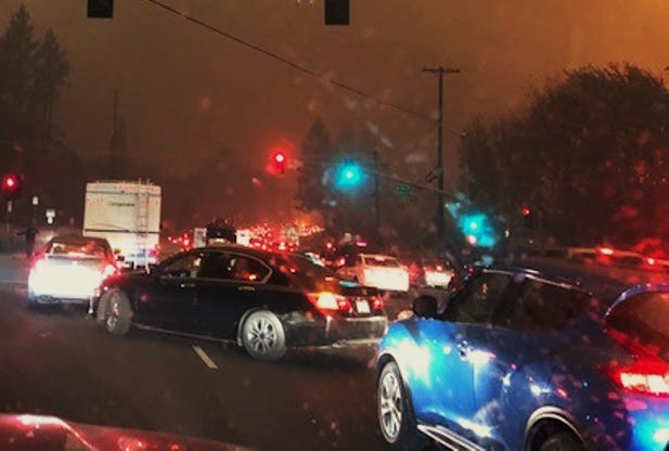 But after an hour or so, we slowly emerged from the trees, somehow never overcome by the flames. Traffic began to move. I thought I was safe. But soon we were directed down a narrow road and traffic came to a halt.