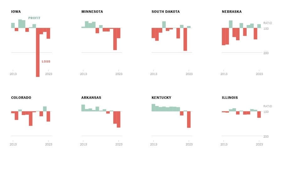 If anyone thinks climate change hasn't already hurt them, they should look at the insurance market. Home insurance has gone up anywhere from 30 to 60 percent just since 2018. Insurance companies are fleeing states like California and Florida. They're even abandoning places like Iowa, once known for stable weather. States are begging them to stay, "offering them more flexibility to raise premiums or drop certain homes from coverage." So, they can collect and collect insurance from you, but once your home is too risky, they'll just cut you loose.