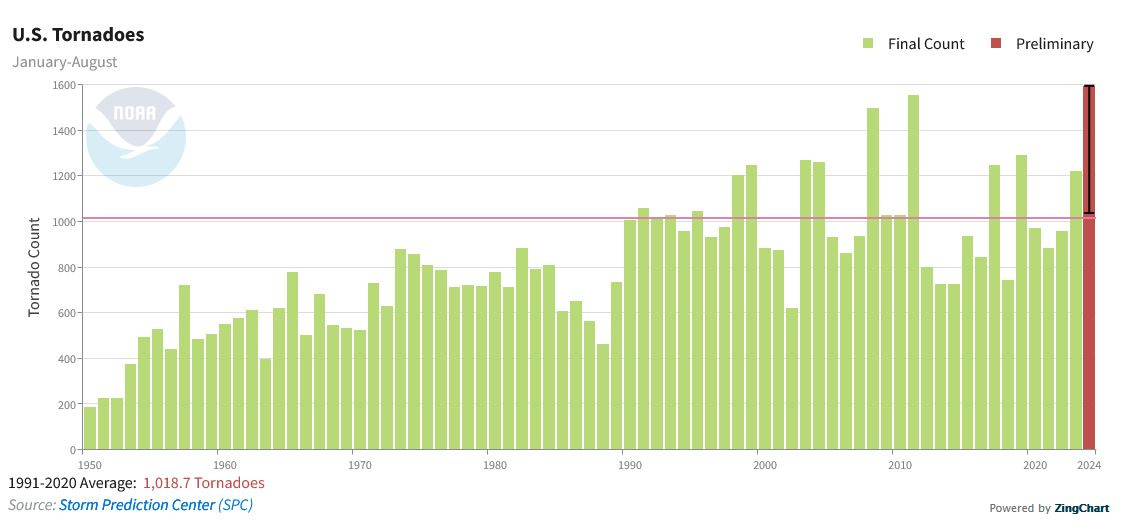 We’re on track for the worst tornado year on record. In fact, many states have already declared their most active tornado years ever. The worst tornado years in the 1970s and 1980s are about average now: