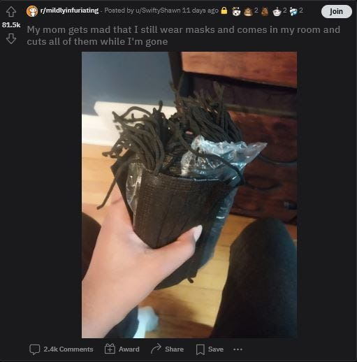 Let’s say you’re still trying to mask up during what many of us consider an ongoing pandemic, or maybe you’re just wearing one to protect yourself from all the volatile compounds in the wildfire smoke you’re being forced to breathe. Instead of supporting you, your mom sneaks into your room while you’re out and cuts up your masks.