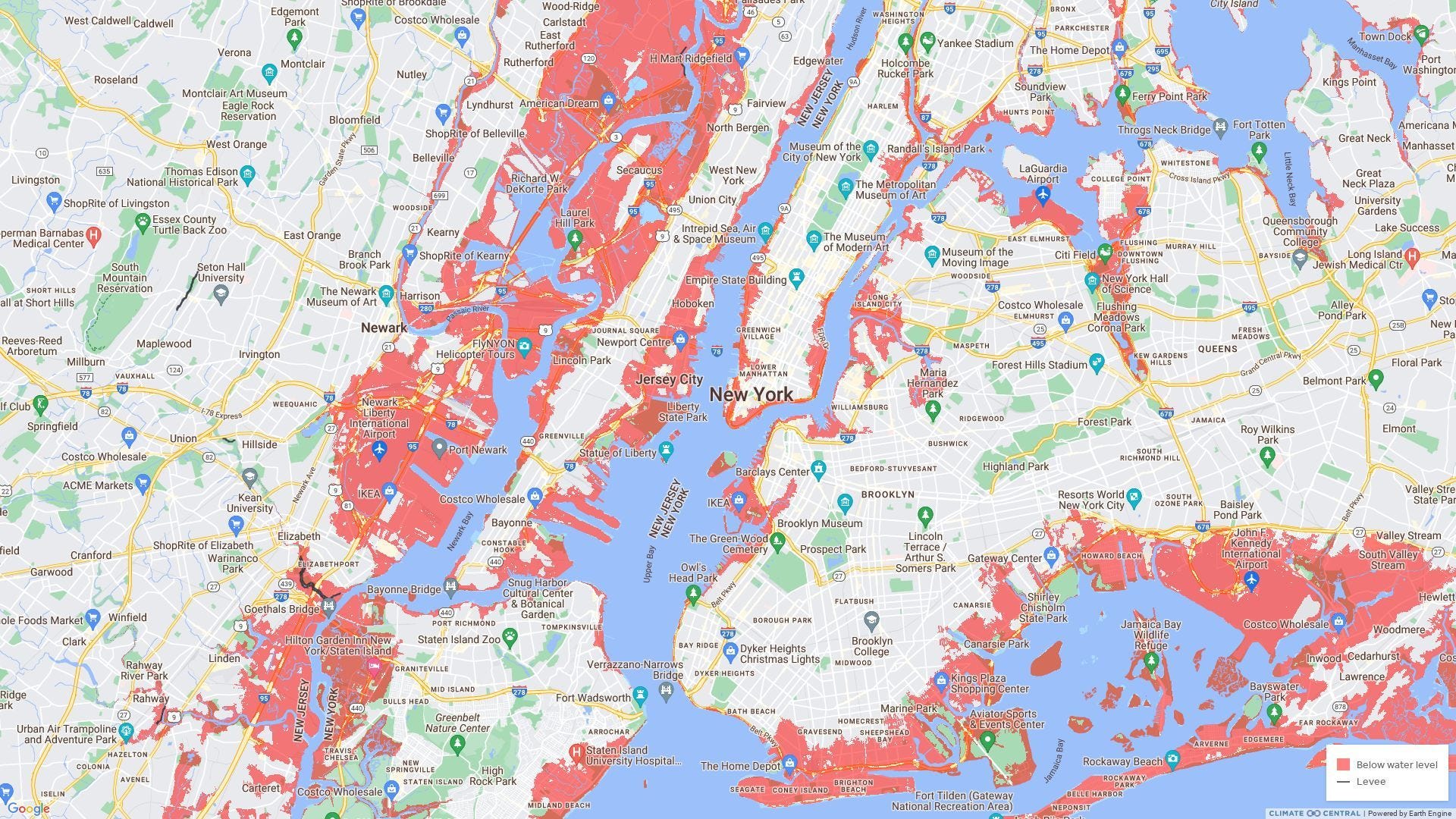 It can be hard to visualize something like sea levels rising. To help with that, Climate Central released a map where you can actually see what happens to different cities in different scenarios. Here's what happens to New York if sea levels rise by 3 meters: