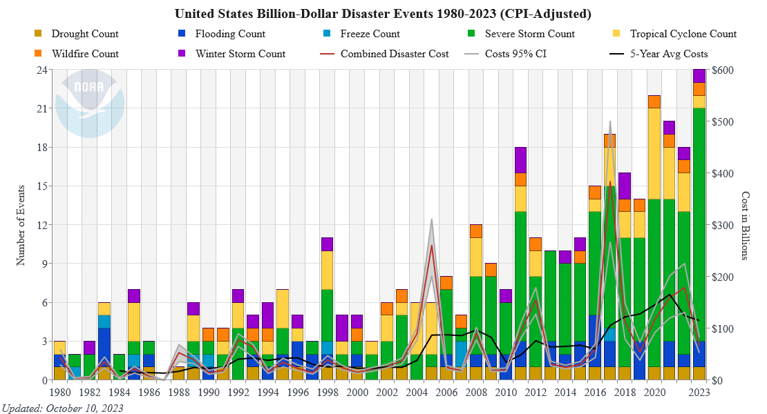 I'm sure the National Centers for Environmental Information would like a word with these people. This past year saw more 1-billion dollar disasters than any in history, by a lot. Here's another chart: