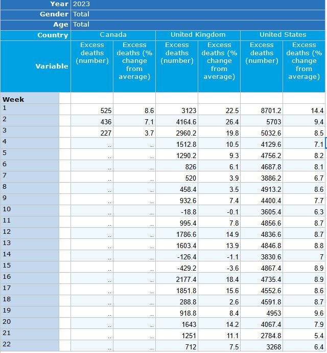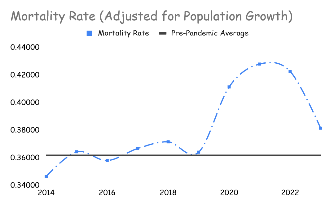 If we use the original method to calculate excess deaths, it remains significantly higher than it was before Covid. My numbers put us at 5.5 percent above the baseline for the year 2023, and that’s a low estimate. The Organization for Economic Cooperation and Development puts us at 8-14 percent.