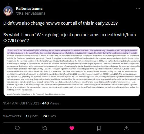 Yes, they absolutely did change how they count all of this. And yes, it very much does sound like they’re opening their arms to Covid deaths. Many of us were suspicious, but we didn’t have confirmation. The CDC buried this little tweak in their Covid excess mortality dashboard.