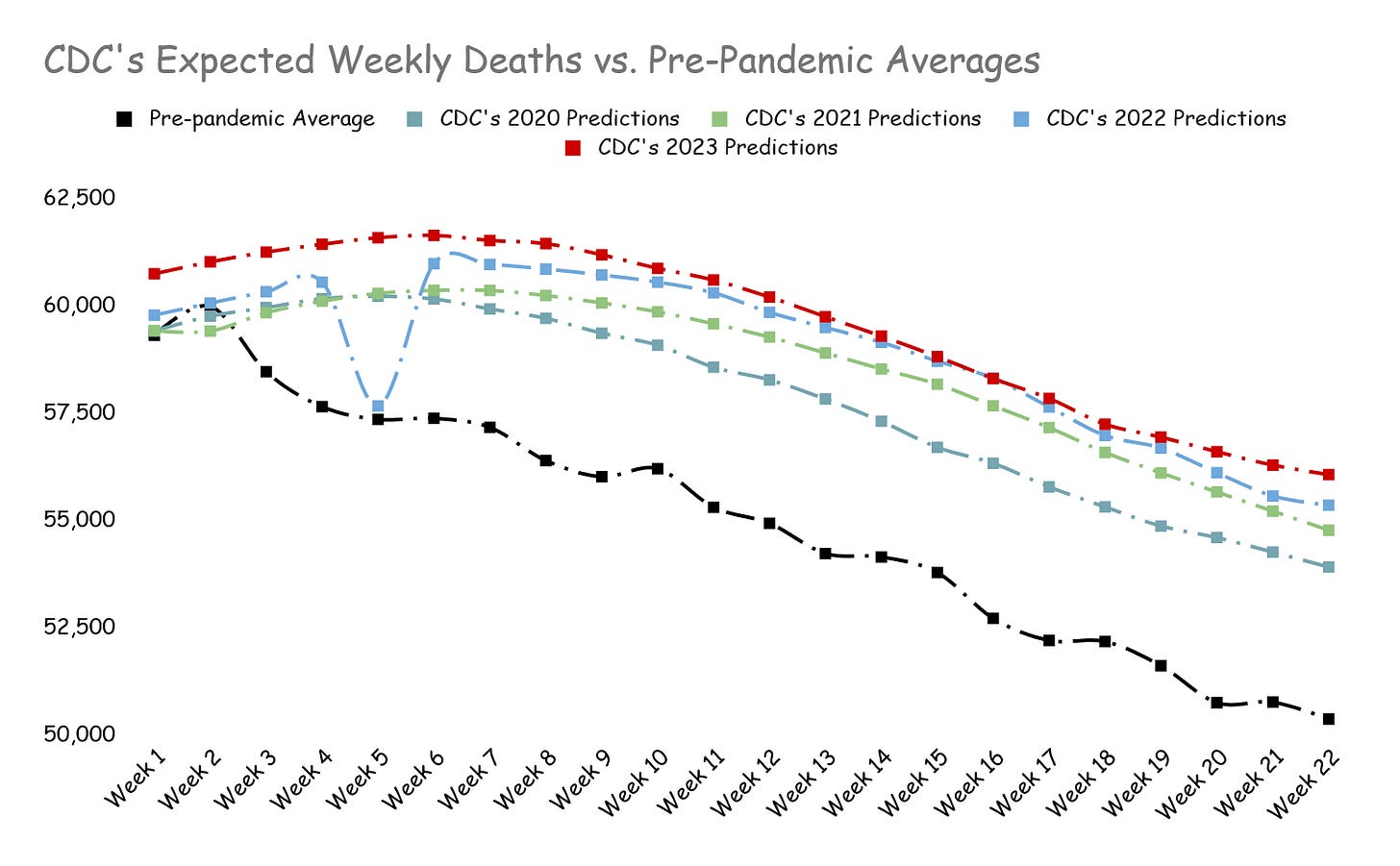 It’s an artificial drop. The CDC achieved this drop by manipulating their weekly mortality predictions. We need to be crystal clear here. Nothing has changed in reality. Covid hasn’t become an “ordinary illness.” It’s still killing and disabling as much as ever, just at a steadier pace.