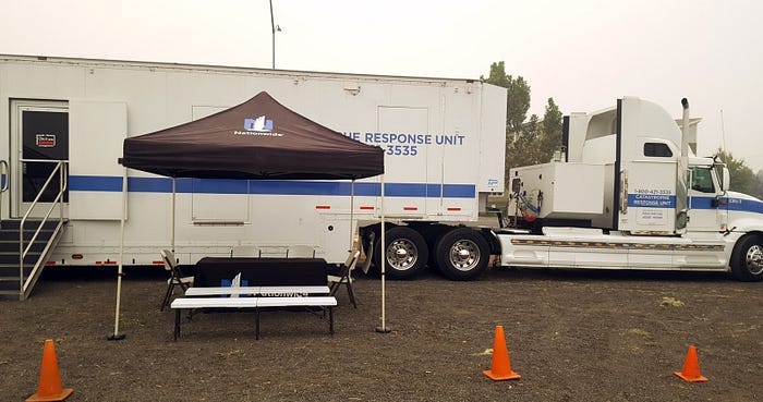 You may not be aware, but after a mass disaster, all the major insurers send big semis full of adjusters to the site of the disaster. There were vans from Nationwide, State Farm, Allstate, AAA, and several others after the Camp Fire.