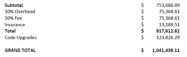But even if we had gotten every single penny of insurance and our bank had forgiven our mortgage out of hearts bursting with compassion, would that $544,950 have been enough to rebuild?