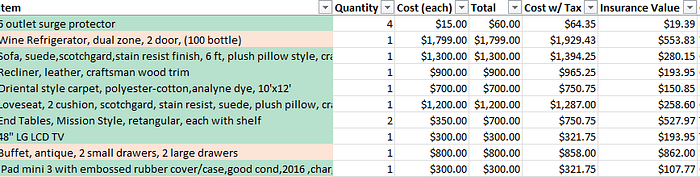 Here’s a snippet from my spreadsheet. The replacement cost for just the items listed was $8,643.28. The amount given to us by our insurance was only $3,148.46, only 36% of the cost to replace those items.