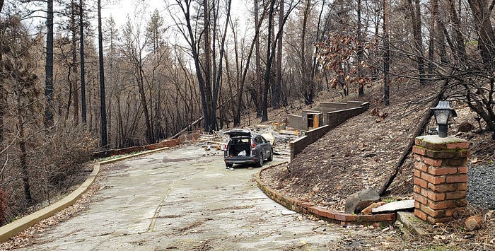 About a month after the Camp Fire, we got a letter from our mortgage holder, a small, not particularly efficient bank based in the San Francisco Bay area. It had come to their attention that the “collateral” on our mortgage had recently undergone a radical devaluation, and they wanted us to pay off our mortgage.