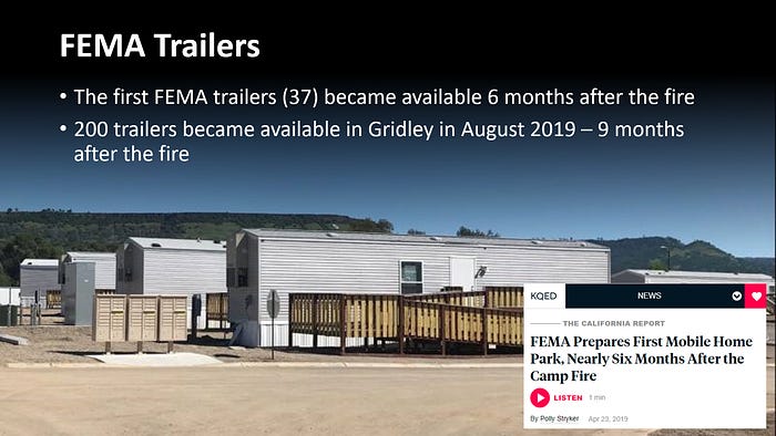 And I also know that even though 14,000 homes were destroyed in the Camp Fire, it was 6 months before FEMA got even one trailer in place. Nine months after the fire, just over 200 FEMA trailers were in place. Way too little, way too late.