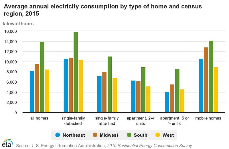 It’s easy to see why single-family detached homes in the southern states use the most electricity. It’s hot and humid, and we love to run our air conditioners full blast all day long.