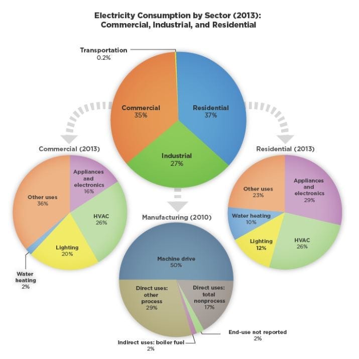 The industrial sector only accounts for about 27 percent of all the electricity we use in the U.S. The lesson here is that we as citizens and consumers have a lot of direct control over how much power we need to run our daily lives. We have much more say than we think.
